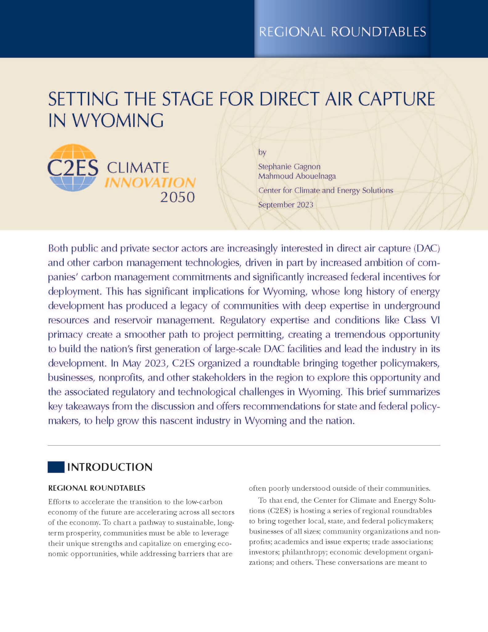 Both public and private sector actors are increasingly interested in direct air capture (DAC) and other carbon management technologies, driven in part by increased ambition of companies’ carbon management commitments and significantly increased federal incentives for deployment. This has significant implications for Wyoming, whose long history of energy development has produced a legacy of communities with deep expertise in underground resources and reservoir management. Regulatory expertise and conditions like Class VI primacy create a smoother path to project permitting, creating a tremendous opportunity to build the nation’s first generation of large-scale DAC facilities and lead the industry in its development. In May 2023, C2ES organized a roundtable bringing together policymakers, businesses, nonprofits, and other stakeholders in the region to explore this opportunity and the associated regulatory and technological challenges in Wyoming. This brief summarizes key takeaways from the discussion and offers recommendations for state and federal policymakers, to help grow this nascent industry in Wyoming and the nation.