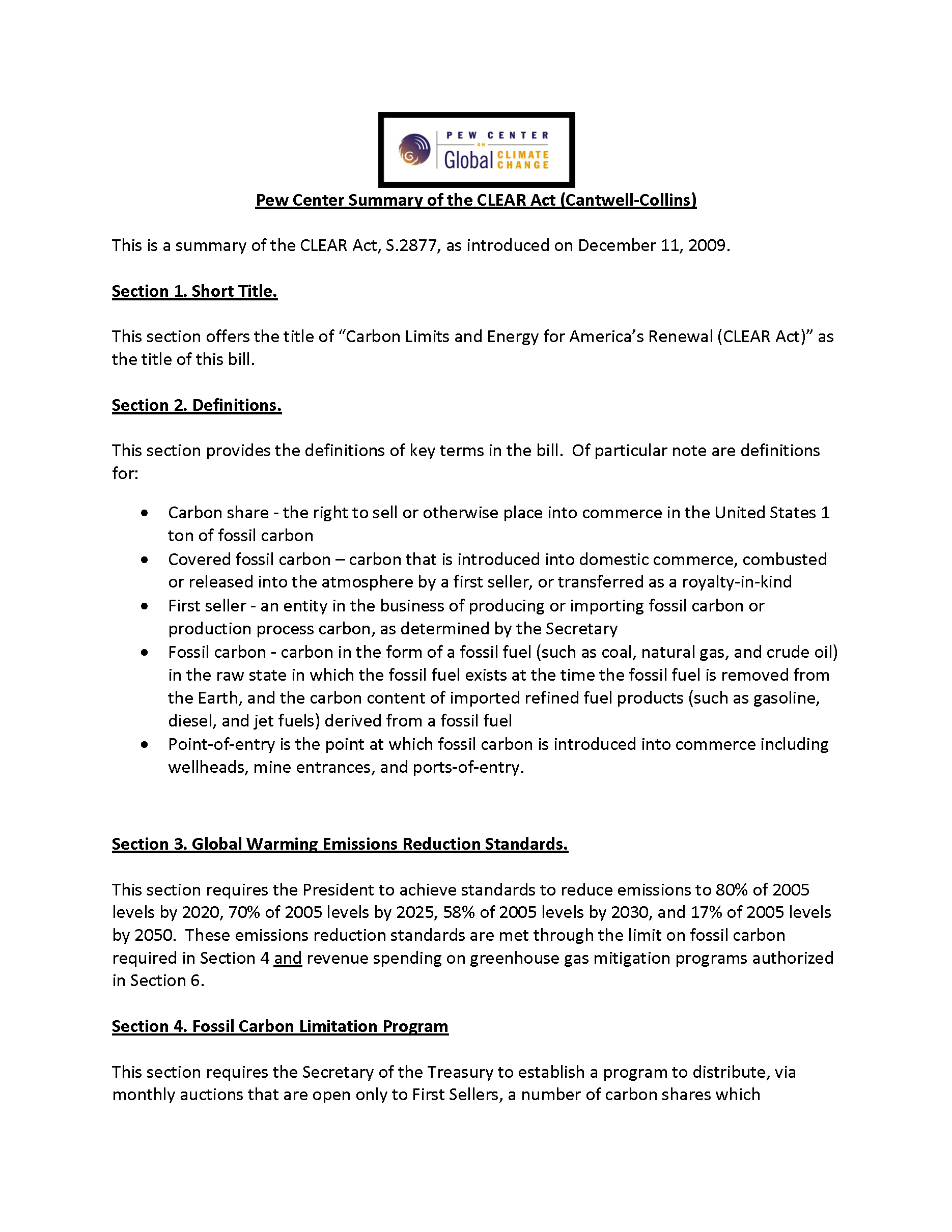 Summary of the Carbon Limits and Energy for America’s Renewal (CLEAR) Act (S.2877)