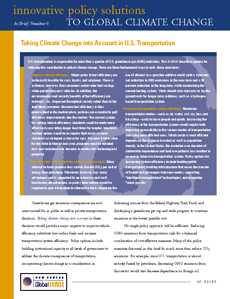 Greenhouse gas emissions consequences are now unaccounted for in public as well as private transportation decisions. Taking climate change into account in these decisions would provide a major impetus to improve vehicle efficiency, substitute low-carbon fuels, and increase transportation system efficiency. Policy options include building institutional capacity at all levels of government to address the climate consequences of transportation, incorporating climate change as a consideration in disbursing monies from the federal Highway Trust Fund, and developing a greenhouse gas cap and trade program to constrain emissions at the lowest possible cost.