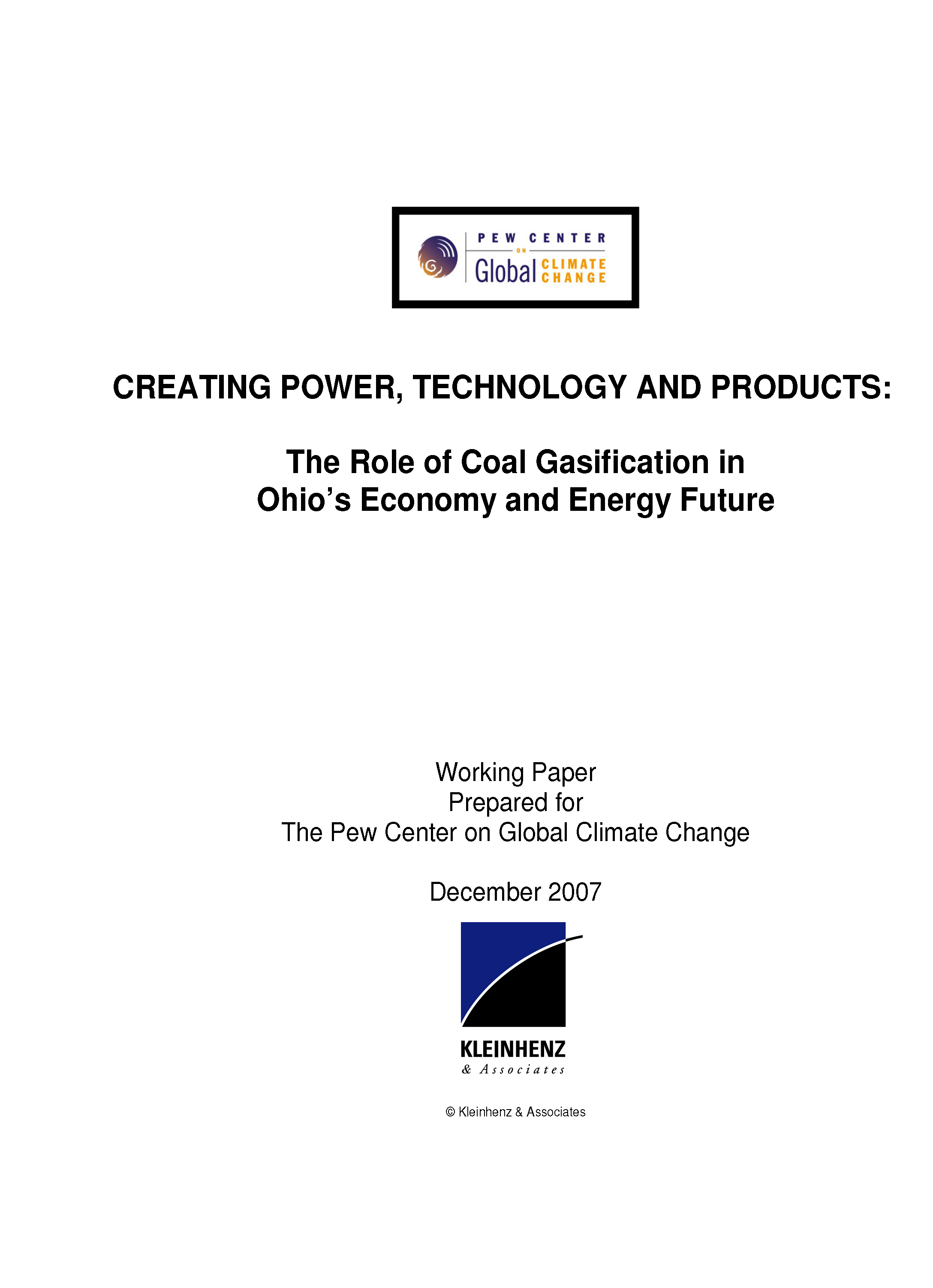 The Pew Center on Global Climate Change commissioned Kleinhenz and Associates to examine how coal gasification (CG) combined with Carbon Capture and Sequestration (CCS) technology could play a role in Ohio’s economy and energy future – particularly in Northeast Ohio, a major center of manufacturing in the U.S. This working paper focuses primarily on opportunities for gasification projects to augment Ohio’s economy. It examines economic activity factors related to coal gasification and how the location of a number of key support industries in Ohio could provide the state with a competitive advantage in this area. The study focuses on a polygeneration facility that would supply electricity and some other products as an example of the type of gasification facility that could, if a sufficient number of similar facilities were located in the area, serve as the stimulus for a new or expanded industry cluster.