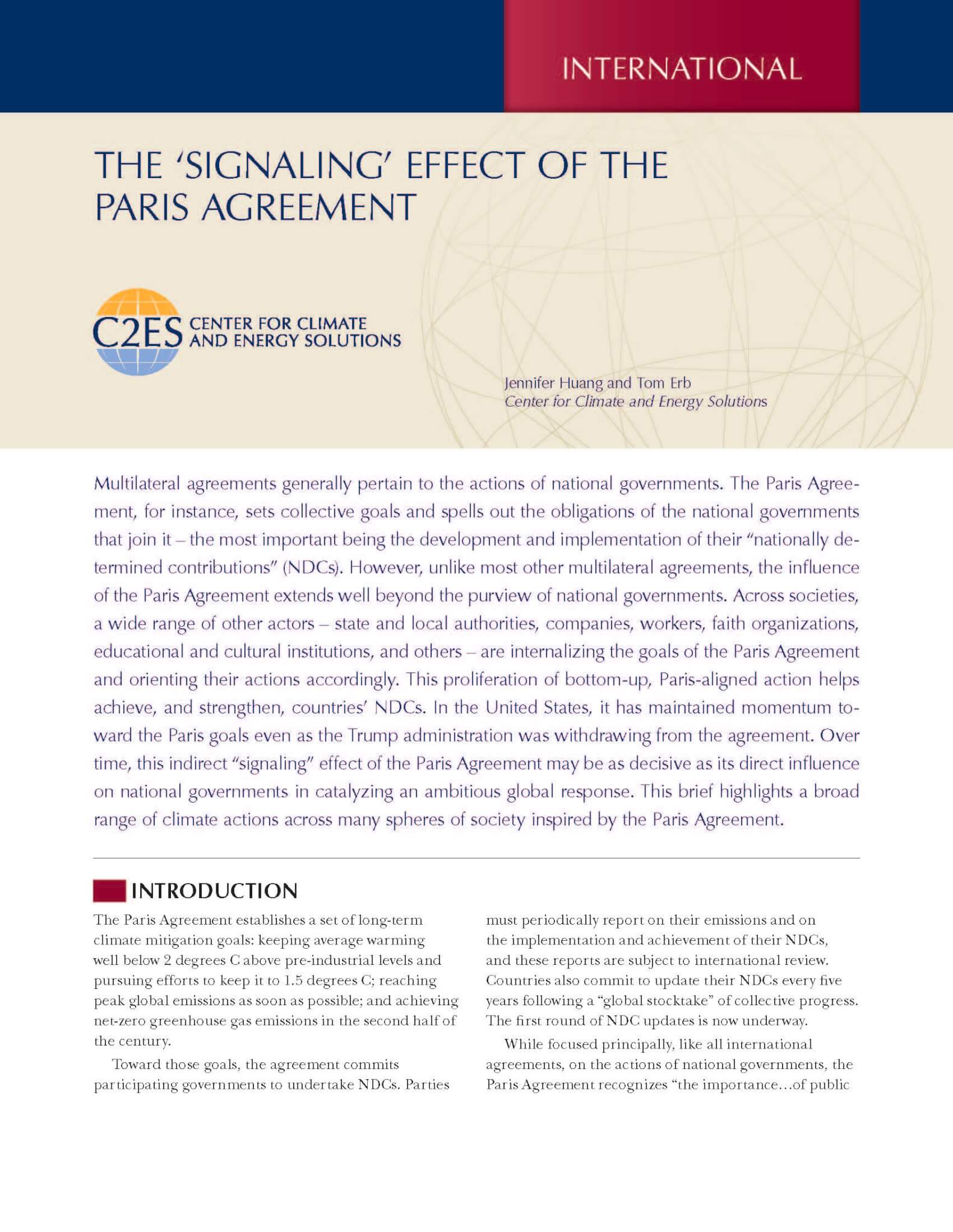 Multilateral agreements generally pertain to the actions of national governments. The Paris Agreement, for instance, sets collective goals and spells out the obligations of the national governments that join it – the most important being the development and implementation of their “nationally determined contributions” (NDCs). However, unlike most other multilateral agreements, the influence of the Paris Agreement extends well beyond the purview of national governments. Across societies, a wide range of other actors – state and local authorities, companies, workers, faith organizations, educational and cultural institutions, and others – are internalizing the goals of the Paris Agreement and orienting their actions accordingly. This proliferation of bottom-up, Paris-aligned action helps achieve, and strengthen, countries’ NDCs. In the United States, it has maintained momentum toward the Paris goals even as the Trump administration was withdrawing from the agreement. Over time, this indirect “signaling” effect of the Paris Agreement may be as decisive as its direct influence on national governments in catalyzing an ambitious global response. This brief highlights a broad range of climate actions across many spheres of society inspired by the Paris Agreement.