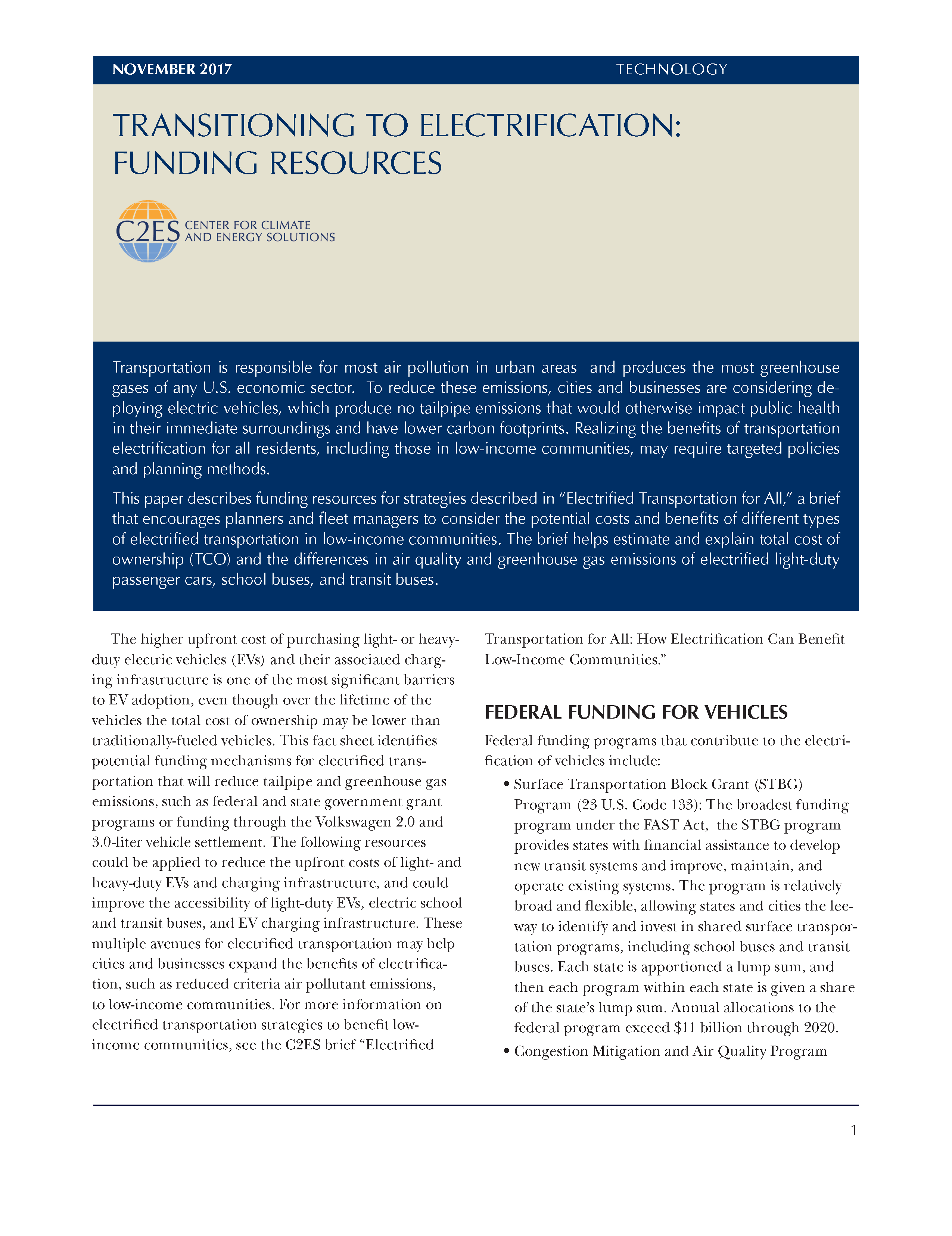 This paper describes funding resources for strategies described in “Electrified Transportation for All,” a brief that encourages planners and fleet managers to consider the potential costs and benefits of different types of electrified transportation in low-income communities. The brief helps estimate and explain total cost of ownership (TCO) and the differences in air quality and greenhouse gas emissions of electrified light-duty passenger cars, school buses, and transit buses.