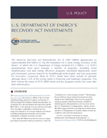 The American Recovery and Reinvestment Act of 2009 (ARRA) appropriated an unprecedented $90 billion to “lay the foundation for a clean energy economy of the future,” of which the U.S. Department of Energy received $35.2 billion. U.S. DOE’s appropriations have gone towards a number of programs, including home weatherization and state energy efficiency programs, renewable deployment, smart grid investment, primary research for breakthrough technologies, and loan guarantees for innovative companies. Most of DOE’s funds have been outlaid as planned, although about 1.6% of the money spent in financing now-bankrupt companies. This brief reviews the status of DOE ARRA funds and key programs nearly four years after their authorization.