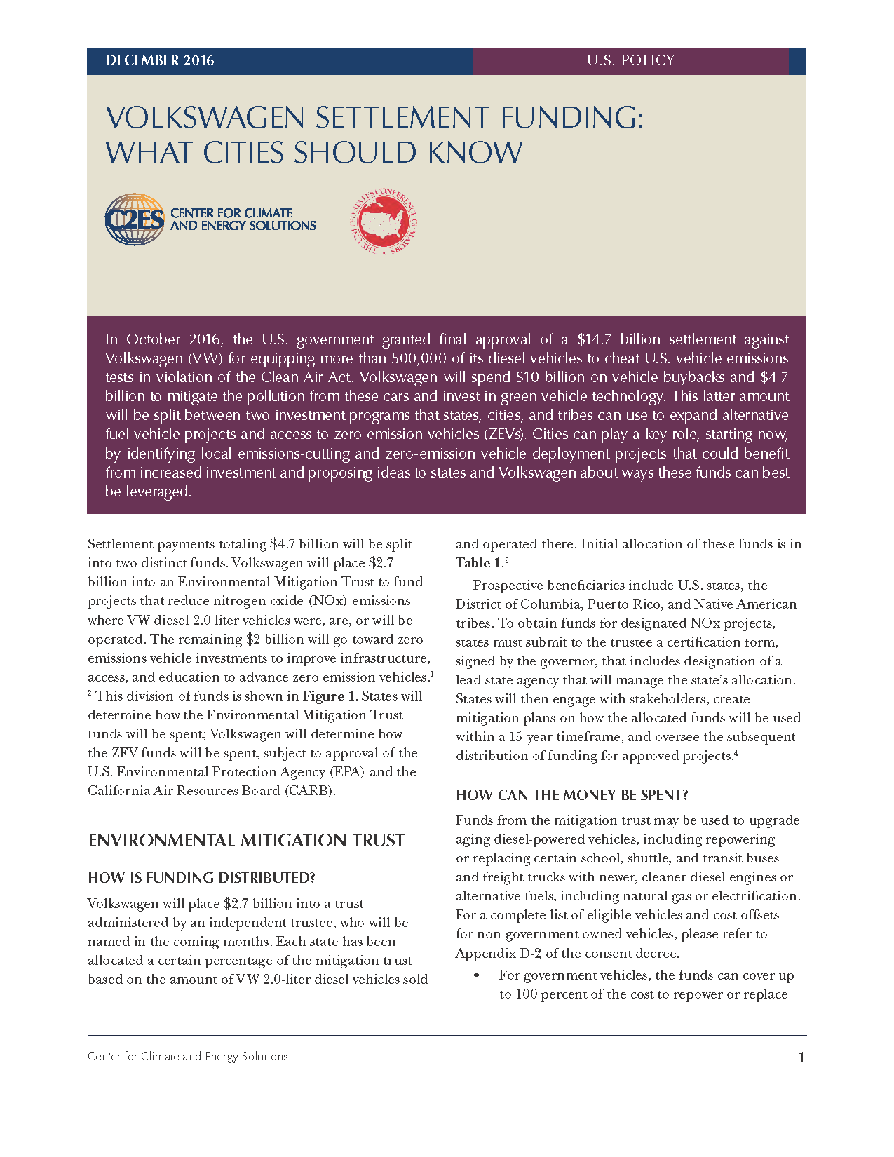 In October 2016, the U.S. government granted final approval of a $14.7 billion settlement against Volkswagen (VW) for equipping more than 500,000 of its diesel vehicles to cheat U.S. vehicle emissions tests in violation of the Clean Air Act. Volkswagen will spend $10 billion on vehicle buybacks and $4.7 billion to mitigate the pollution from these cars and invest in green vehicle technology. This latter amount will be split between two investment programs that states, cities, and tribes can use to expand alternative vehicle projects and access to zero emission vehicles (ZEVs). Cities can play a key role, starting now, by identifying local emissions-cutting and zero-emission vehicle deployment projects that could benefit from increased investment and proposing ideas to states and Volkswagen about ways these funds can best be leveraged.