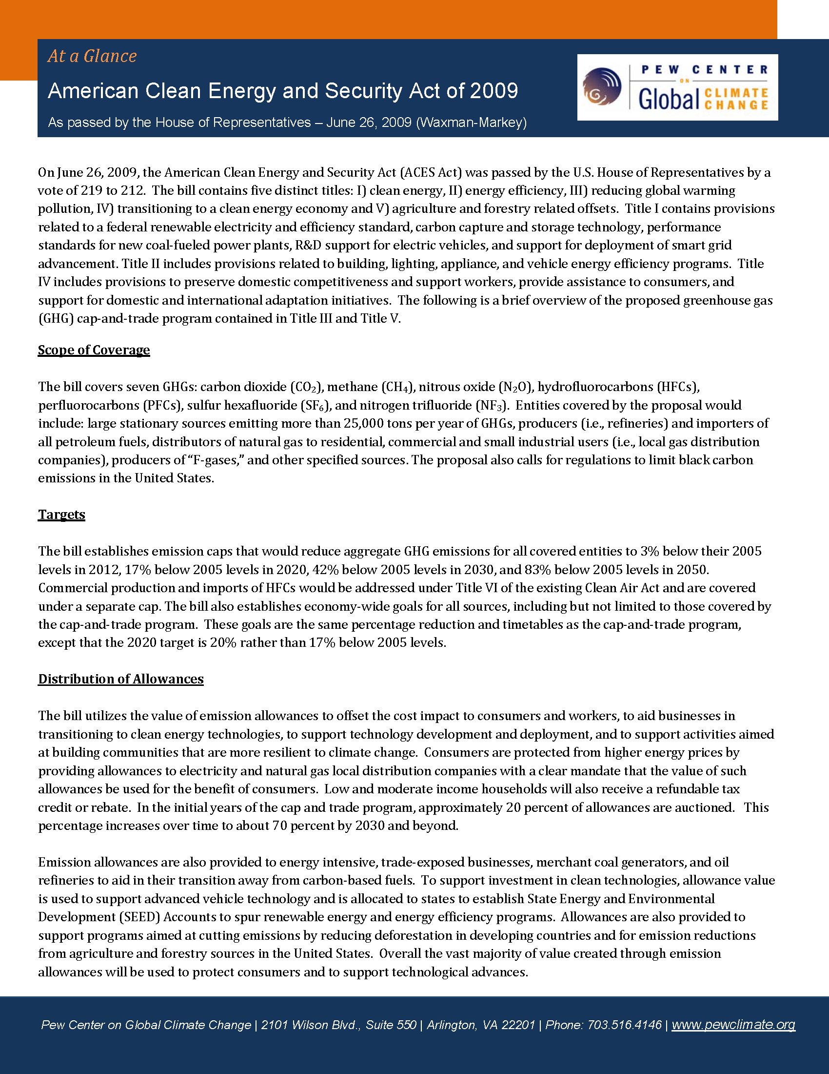 On June 26, 2009, the American Clean Energy and Security Act (ACES Act) was passed by the U.S. House of Representatives by a vote of 219 to 212. The bill contains five distinct titles: I) clean energy, II) energy efficiency, III) reducing global warming pollution, IV) transitioning to a clean energy economy and V) agriculture and forestry related offsets. Title I contains provisions related to a federal renewable electricity and efficiency standard, carbon capture and storage technology, performance standards for new coal-fueled power plants, R&D support for electric vehicles, and support for deployment of smart grid advancement. Title II includes provisions related to building, lighting, appliance, and vehicle energy efficiency programs. Title IV includes provisions to preserve domestic competitiveness and support workers, provide assistance to consumers, and support for domestic and international adaptation initiatives. The following is a brief overview of the proposed greenhouse gas (GHG) cap-and-trade program contained in Title III and Title V.