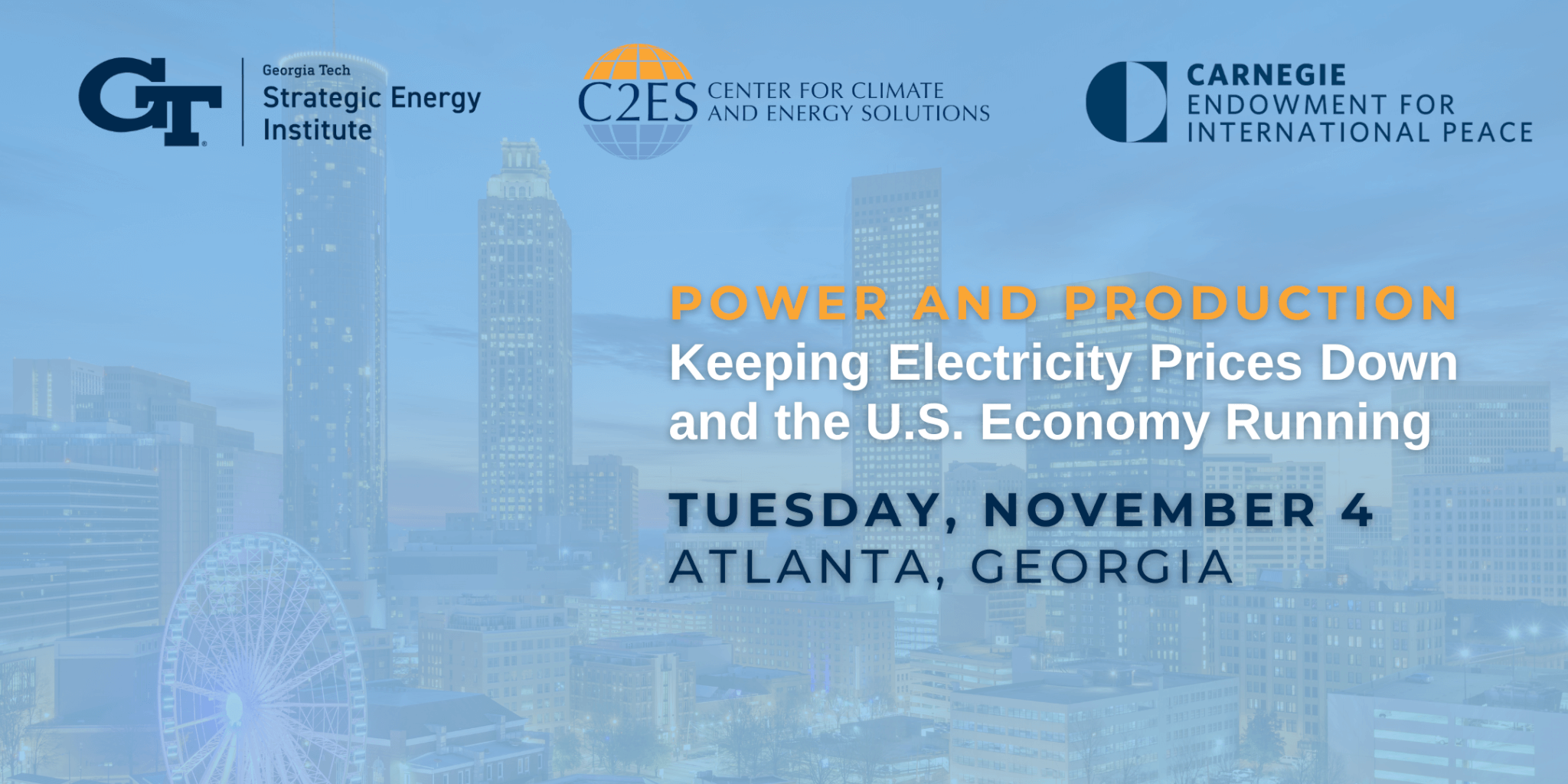 On November 4th, Join the Carnegie Endowment for International Peace, the Center for Climate and Energy Solutions, and Georgia Tech’s Strategic Energy Institute for a panel discussion on Power and Production: Keeping Electricity Prices Down and the U.S. Economy Running. This 45 minute panel discussion will be followed by audience Q&A and a reception.